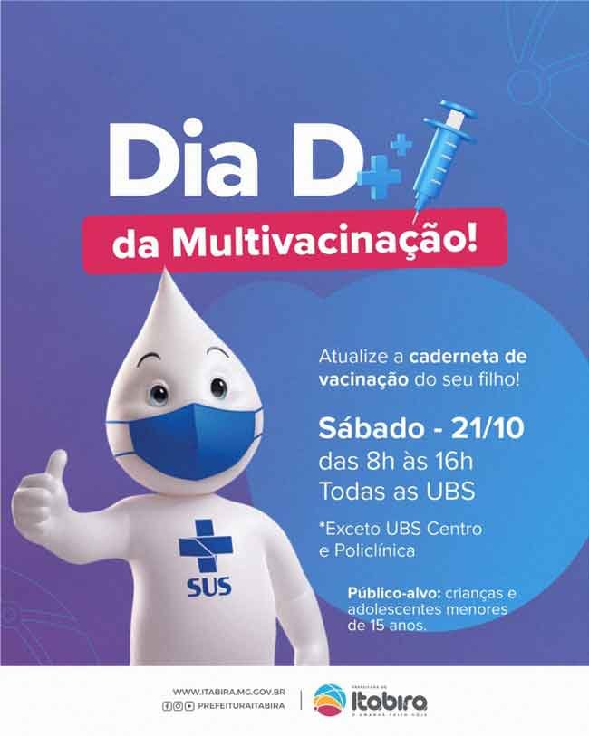 Neste sábado (21), Prefeitura de Itabira realiza o Dia D (mobilização nacional) da Campanha de Multivacinação. Com o objetivo de garantir que crianças e adolescentes que deixaram de tomar alguma dose das vacinas de rotina possam completar o esquema vacinal, a campanha é voltada para o público menor de 15 anos de idade (14 anos, 11 meses e 29 dias).