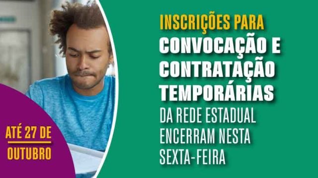 Encerram-se nesta sexta-feira (27/10), às 17h, as inscrições para o Cadastro de Reserva de candidatos às contratações e convocações temporárias dos quadros Administrativo e do Magistério da rede estadual da Secretaria de Estado de Educação de Minas Gerais (SEE/MG). Os interessados devem se inscrever por meio do Sistema de Administração e Gestão de Pessoal Temporário (Siagepe).