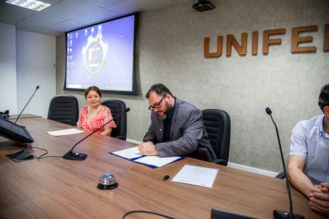 Depois das apresentações feitas, o professor Ancelotti fez a assinatura do memorando de entendimento sobre acordo de parceria tecnológica entre a UNIFEI e a UNI, e o momento foi registrado por meio de fotos.