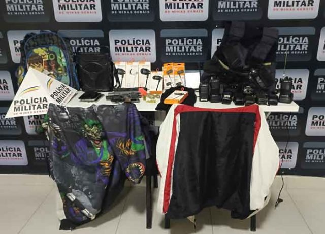 Foi realizada a diligência, sendo o adolescente de 16 anos localizado. No local foram encontradas as vestimentas utilizadas por eles no crime, além de simulacros de arma de fogo, celulares e 01 capa de colete balístico; 09 rádio comunicadores; 02 cartuchos vazios de calibres 38 e 9mm e 01 touca de lã (balaclava).