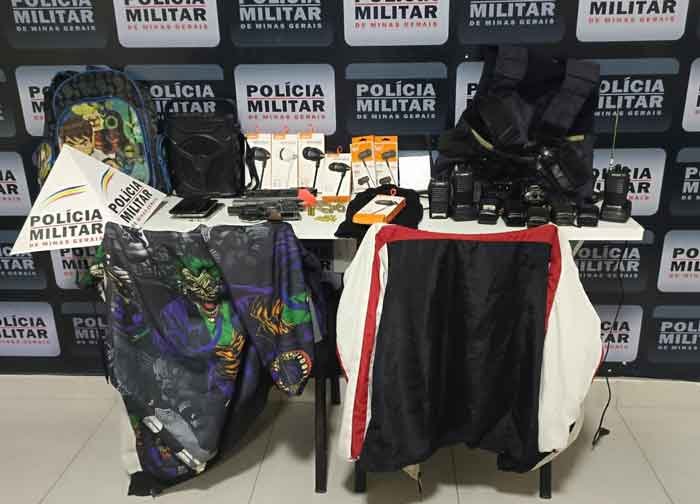 Os autores pegaram uma caixa de som e várias caixas de fone que estavam na prateleira. Logo após saíram correndo do local, sentido a rodoviária.