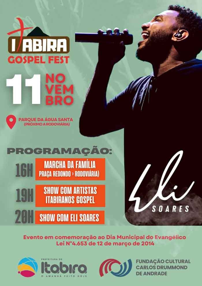 No próximo dia 11 de novembro a primeira edição do Itabira Gospel Fest vai proporcionar uma festa com louvor e muita música. O objetivo é reunir a comunidade evangélica da região e destacar momentos de reflexão. O evento será gratuito, com uma caminhada saindo da Praça Acrísio Alvarenga, às 16h. O percurso vai até a rodoviária e, a partir das 18h, em frente ao Parque Municipal da Água Santa, a festividade continua com atrações de música gospel.