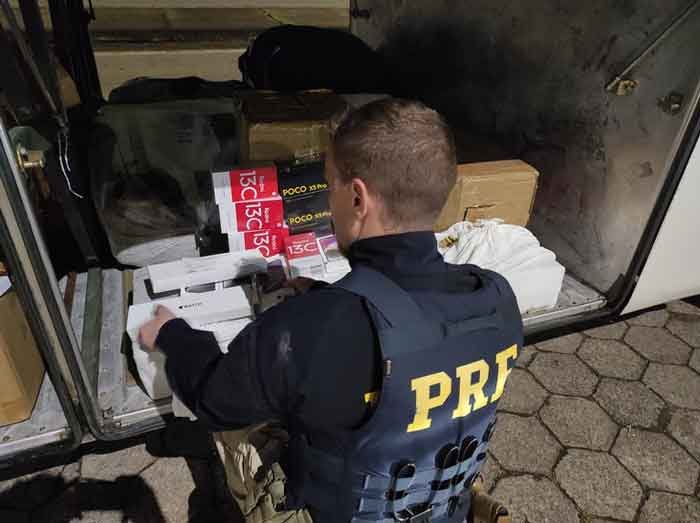 Durante a fiscalização, os policiais encontraram uma grande quantidade de mercadorias estrangeiras, como celulares, dispositivos eletrônicos diversos, vestuário, calçados e produtos de beleza, nos compartimentos de carga e nos espaços destinados aos passageiros do ônibus, todos desprovidos da documentação fiscal necessária. Isso caracterizou a prática de descaminho. Além disso, foram apreendidos 500 maços de cigarros de procedência paraguaia, cuja comercialização é proibida no Brasil, configurando o crime de contrabando.