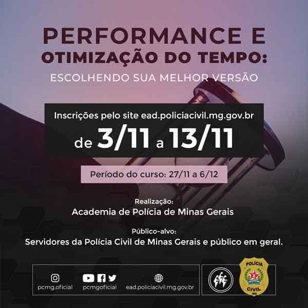 Estão abertas, até a próxima segunda-feira (13/11), as inscrições para o curso “Performance e Otimização do Tempo: Escolhendo sua Melhor Versão”, realizado pela Polícia Civil de Minas Gerais (PCMG), na modalidade de Educação a Distância (EAD), voltado a servidores da instituição e ao público em geral.