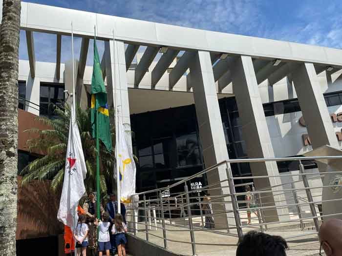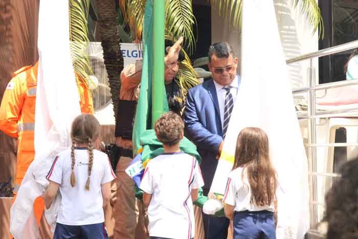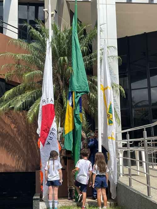 O presidente da Casa, Heraldo Noronha Rodrigues (PTB) convidou o comandante da PMMG Capitão Flávio Batista, 1º Tenente Jocélio Gonçalves de Souza e os três alunos Lucas, Antonella e Maria Fernanda da Fundação Itabirana Difusora do Ensino -FIDE para o ritual de hasteamento das bandeiras na área externa do prédio.