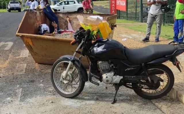 Na tarde de segunda-feira (20/11), um incidente inusitado chamou a atenção em Uberlândia. Uma motociclista de 35 anos acabou dentro de uma caçamba após se distrair e perder o controle da direção na Avenida Carlito Cordeiro, no Bairro Jardim Karaíba. As fotos do ocorrido viralizaram nas redes sociais.