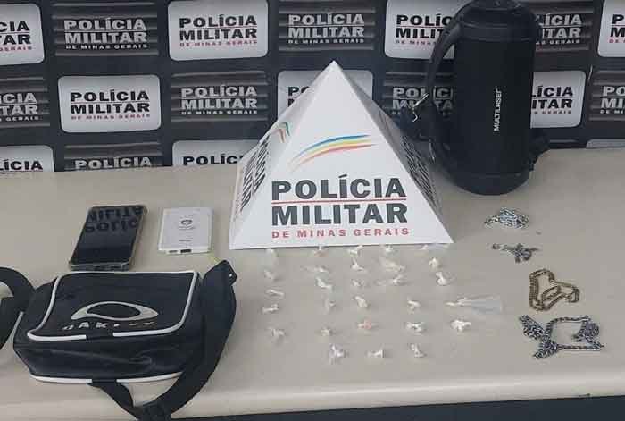Entre os itens apreendidos estão as 28 pedras de crack, uma quantia de R$2,00 em dinheiro, um cordão dourado, dois cordões prateados, uma caixa de som Multilaser SP600, um carregador portátil HMASTON PRO Power Bank e um celular REDMI Azul.