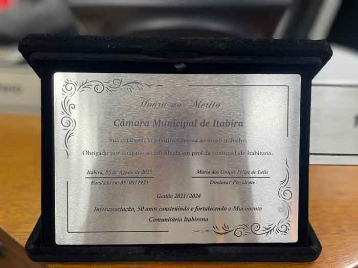 A Interassociação de Itabira encaminhou a Câmara Municipal uma placa de Honra ao Mérito pelo valioso trabalho prestado à comunidade Itabirana.