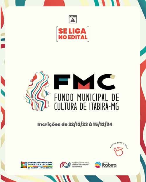 A Fundação Cultural Carlos Drummond de Andrade, torna público que estarão abertas as inscrições aos interessados concorrer ao processo de apresentação e seleção de projetos culturais, para obtenção de benefícios do Fundo Municipal de Cultura-FMC, no período de 22/12/2023 até às 18 horas do dia 15/02/2024.