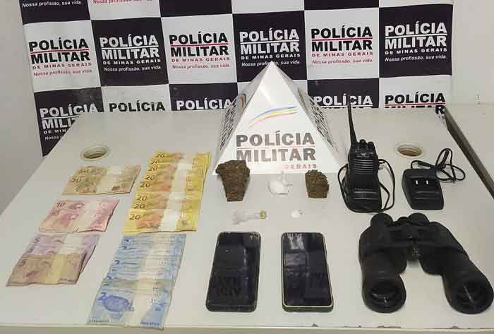 Os Materiais apreendidos, 02( dois) tabletes de material de origem vegetal semelhante a maconha; 01(um) invólucro grande contendo material em pó análogo a cocaína; 01(um) invólucro pequeno contendo material em pó análogo a cocaína; 01(uma) pedra média de material com odor e características semelhantes ao crack; R$311,00 ( trezentos e onze reais) em moeda corrente; 01 (um) rádio comunicador; 02 (duas) bases de carregamento para os rádios comunicadores; 01(um) binóculo e 02 (dois) aparelhos celulares;