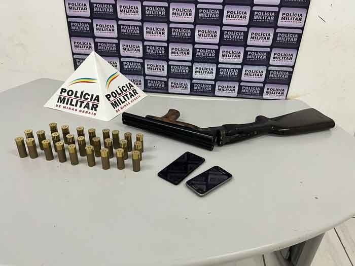 Nesta quarta-feira (03/01) por volta das 20h32min, a Polícia Militar de Itabira/MG, atendendo a uma ocorrência na Rua Capim Cheiroso, prendeu um homem suspeito de 25 anos acusado de roubo e apreendeu uma escopeta calibre 12, marca Rossi, além de 26 cartuchos intactos do mesmo calibre. Dois aparelhos celulares também foram apreendidos.