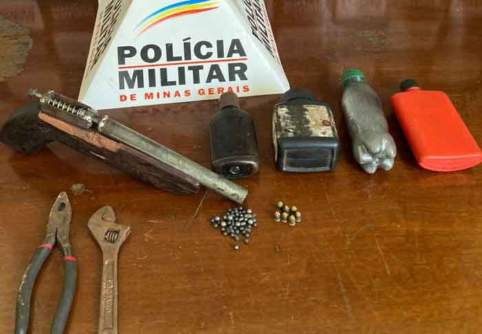 Os materiais apreendidos incluíram 01 garrucha, 01 recipiente contendo pólvora branca, 01 recipiente contendo pólvora, 01 recipiente contendo esfera de chumbo, 07 unidades de espoleta, 01 alicate e 01 chave.
