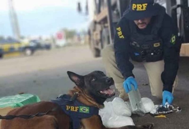 Durante as vistorias dos veículos transportados, os policiais localizaram uma caixa com 11 pacotes e 01 tablete de Cloridrato de Cocaína, com apoio dos cães farejadores da PRF. Se comercializada, a droga poderia render aproximadamente R$ 2,2 milhões ao tráfico de drogas.
