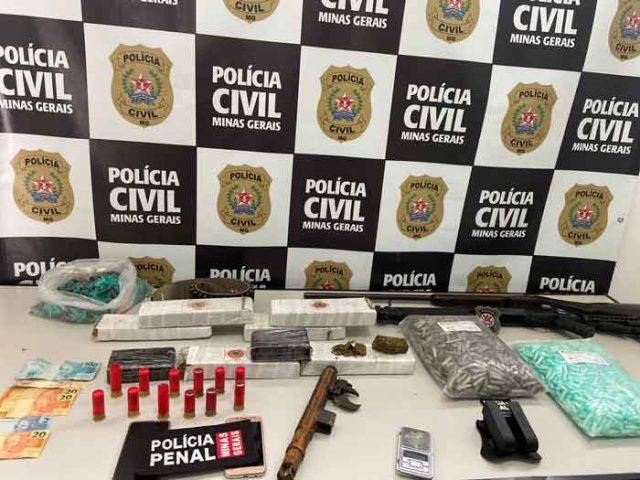 Ainda no curso dos trabalhos, equipes da PCMG cumpriram dez ordens de busca e apreensão em diversos bairros da cidade, resultando na localização de mais de dois mil pinos de cocaína, oito tabletes e outras porções pequenas de maconha, uma pedra grande de crack, uma porção de haxixe, duas espingardas calibres 12 e 28, dez munições calibre 12, duas balanças de precisão, pequena quantia em dinheiro, material para embalar drogas, além de oito gaiolas com pássaros mantidos de forma irregular (encaminhados à Polícia Militar Ambiental).