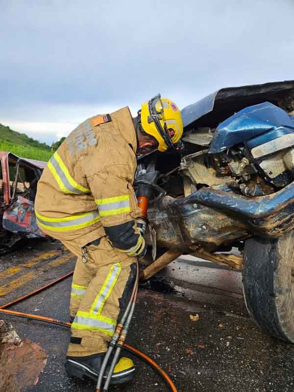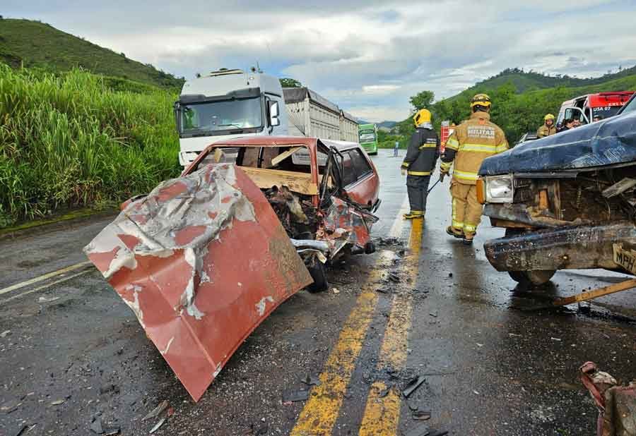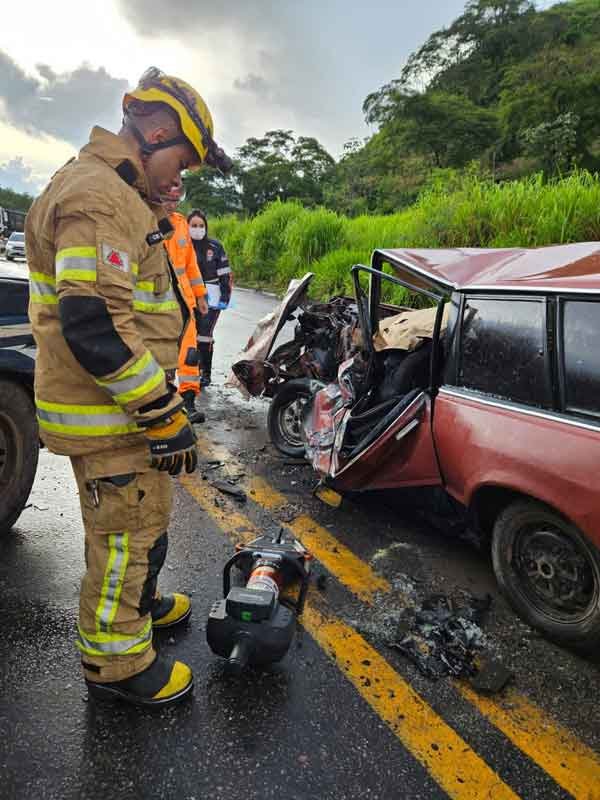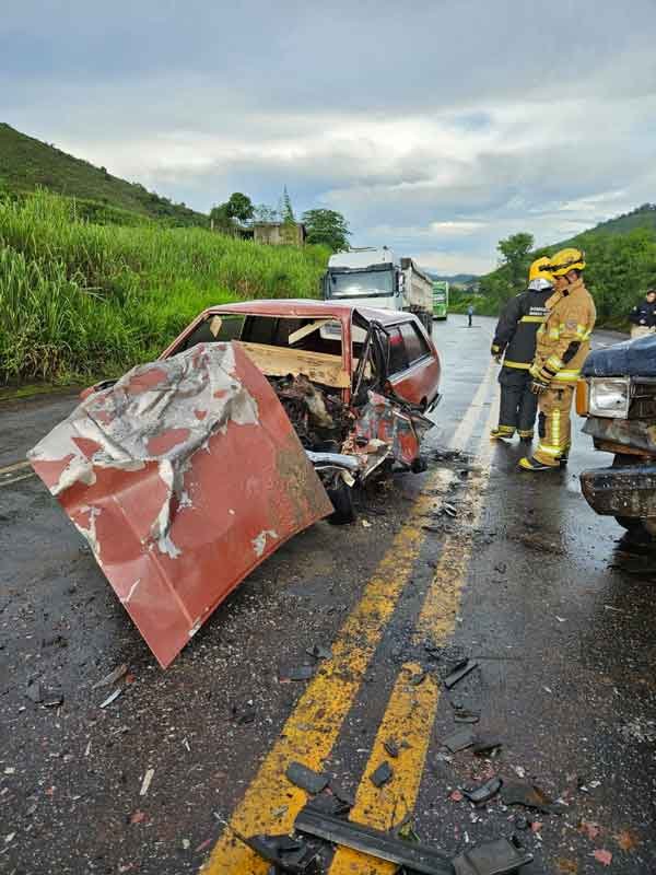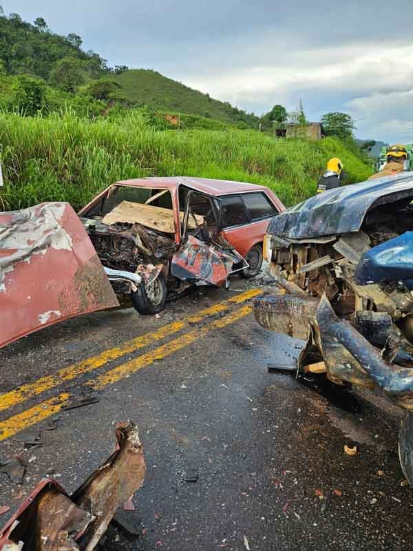 A colisão violenta ocorreu entre dois veículos, culminando na morte de dois passageiros que estavam no mesmo automóvel. A gravidade do acidente exigiu a intervenção dos bombeiros, que utilizaram desencarceradores para a remoção dos corpos presos às ferragens.