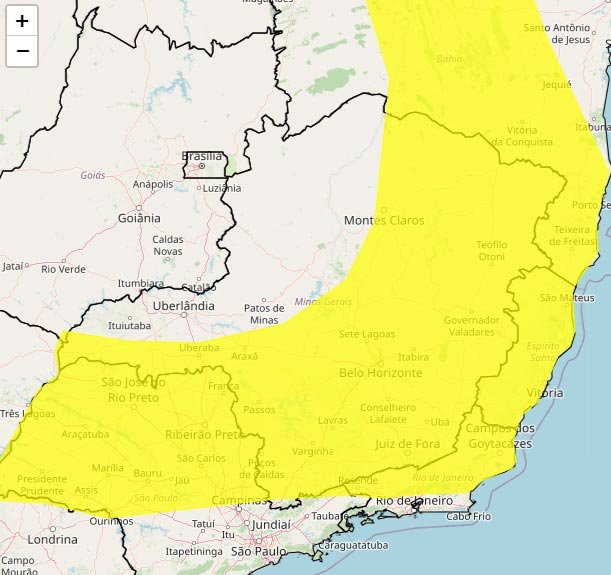 Um aviso de chuvas intensas, com grau de severidade classificado como Perigo Potencial, foi emitido pelo Instituto Nacional de Meteorologia (INMET) para 758 cidades de Minas Gerais. O alerta está previsto iniciando em 08/02/2024 às 09h50min, com término em 09/02/2024 às 10h00min.