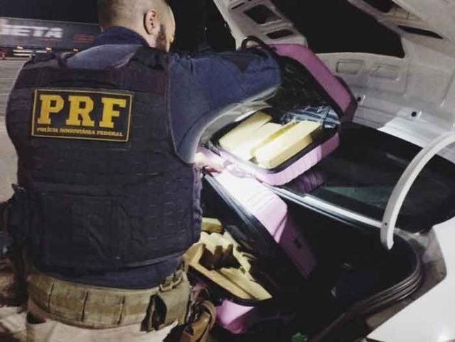 Em ato contínuo, foi solicitado ao motorista a abertura do porta-malas para conferência dos equipamentos obrigatórios. Neste momento, foi sentido um forte odor característico de substância entorpecente. Diante deste fato, a equipe procedeu a vistoria de toda a bagagem, tendo sido localizadas 40 barras de maconha com peso total aproximado de 24kg, que estavam acondicionadas dentro de duas malas de cor rosa.