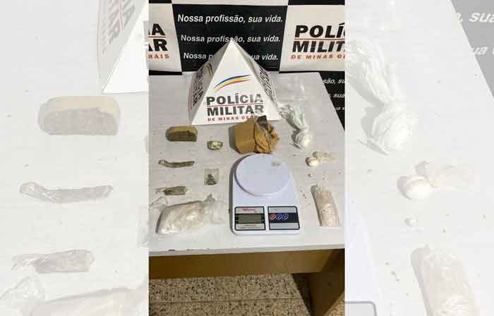 Durante as buscas, com apoio da equipe ROCCA e do cão de faro Aquiles foram localizadas 01 balança de precisão, 03 tabletes, 01 barra e 01 bucha de maconha, 02 porções de cocaína e material para embalar drogas.