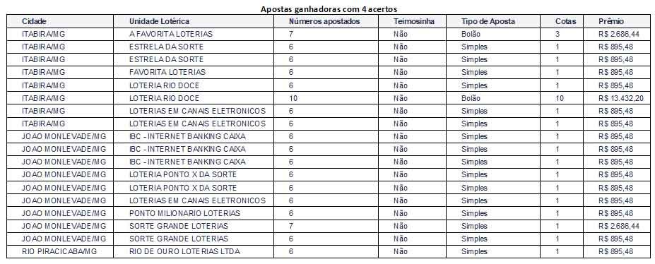 Além disso, houve um número considerável de acertadores de quatro dezenas, totalizando 15.891 pessoas. Cada uma delas receberá o montante de R$ 895,48 como recompensa por seu palpite parcialmente certeiro.