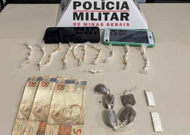 Durante a abordagem, os policiais encontraram com o indivíduo diversos materiais ilícitos, incluindo 38 pedras de crack, 5 buchas de maconha, 2 papelotes de cocaína, além de 2 telefones celulares e R$ 150,00 em dinheiro.