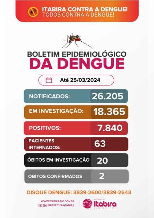 De acordo com o boletim mais recente, com dados de até o dia 25 de março de 2024: foram notificados 26.205 casos de dengue na cidade. Desses, 18.365 estão em fase de investigação, enquanto 7.840 casos foram confirmados.