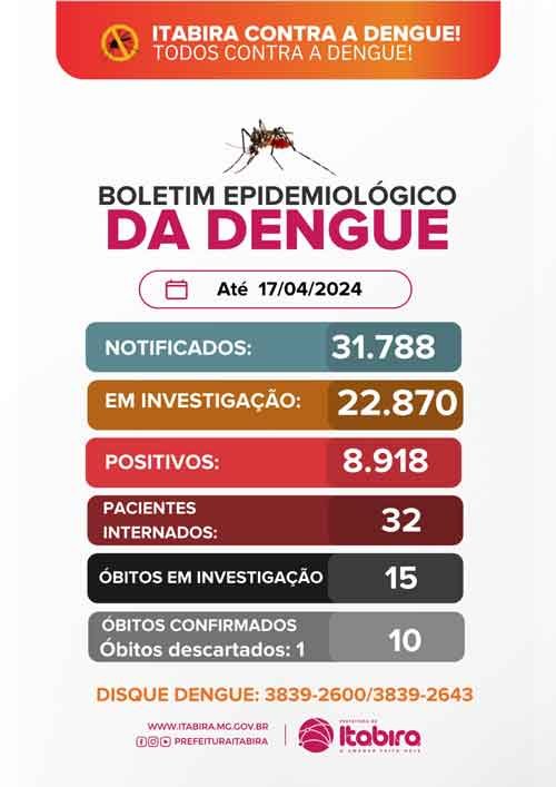 O mais recente boletim epidemiológico da dengue em Itabira, divulgado até o dia 17 de abril de 2024.