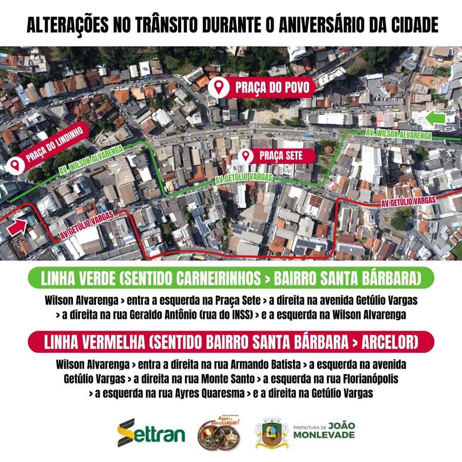 O Setor de Trânsito e Transporte da Prefeitura de João Monlevade (Settran) realiza mudanças nesta sexta-feira, dia 26 de abril, no entorno da Praça do Povo, a partir das 19h, em virtude dos shows em comemoração aos 60 anos da cidade. As alterações seguem até a manhã de terça-feira (30).