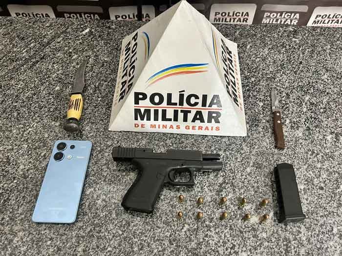 Dentre os materiais apreendidos durante a operação, 01 Pistola Glock .380, 10 Munições .380, 02 Facas e 01 Aparelho Celular