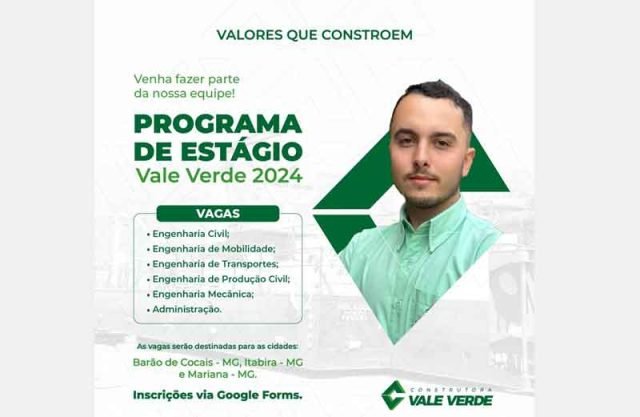 A Construtora Vale Verde está entusiasmada em anunciar, juntamente com sua participação na maior feira de estágio de Minas Gerais, @mercadoemconexao, o lançamento de seu programa de estágio. O processo proporcionará uma oportunidade única para os jovens talentos mergulharem no desafiador e empolgante mundo da Construção Civil Pesada.