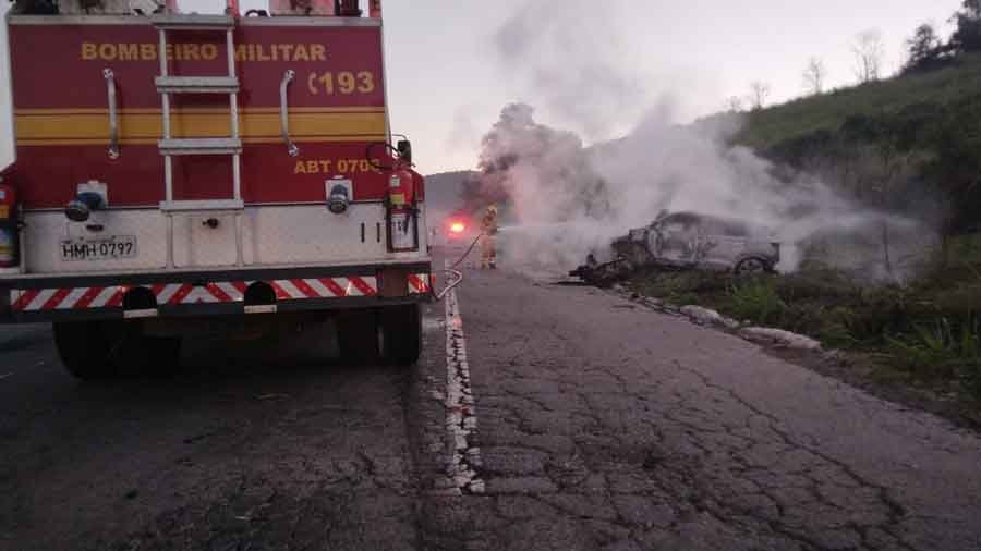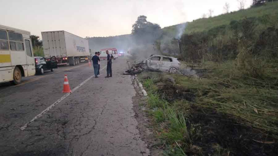 O carro envolvido na colisão acabou pegando fogo após o impacto. As autoridades estão investigando as circunstâncias do acidente.