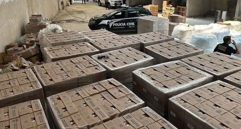 Também foram localizadas caixas de papelão montadas, lacradas, etiquetadas e plastificadas para pronta entrega, rolos de etiquetas contendo número de lote, pistolas de cola quente e outros materiais próprios de uma linha de produção completa.
