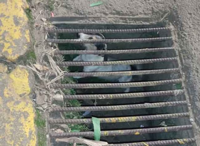 De acordo com o relato de sua tutora, o animal caiu em uma manilha no terreno vizinho e acabou caminhando até o bueiro, onde ficou impossibilitada de sair.
