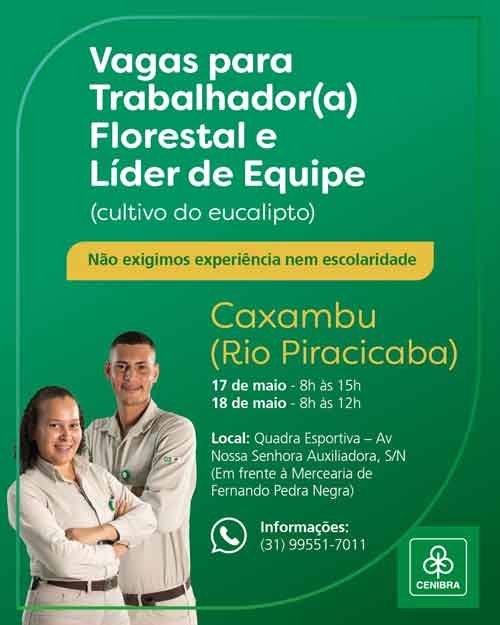 A Cenibra está com vagas abertas para Trabalhador(a) Florestal e Líder de Equipe, para atuação no cultivo do eucalipto, em Caxambu (Rio Piracicaba). Uma excelente oportunidade para quem busca ingressar no mercado de trabalho ou deseja uma nova oportunidade de emprego.