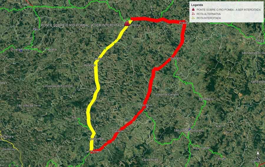 O Departamento de Estradas de Rodagem de Minas Gerais (DER-MG) interditou nesta quinta-feira (23/5), a partir das 10 horas, a passagem para qualquer tipo de veículo, na ponte sobre o Rio Pomba, no km 2,4 da MG-133, localizada entre o entroncamento da MGC-265 (Rio Pomba) até a cidade de Tabuleiro.