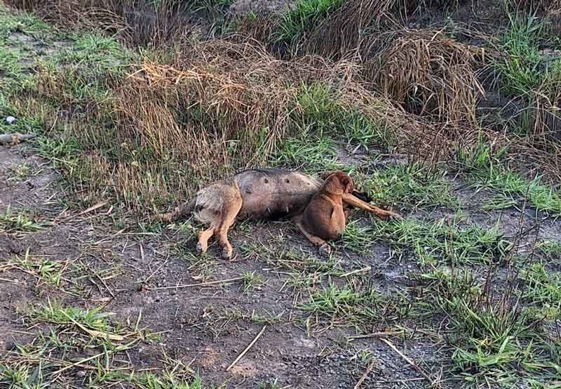 Infelizmente, a mãe já estava sem vida, apresentando ferimentos na cabeça, possivelmente causados por atropelamento. Ao lado dela, a filhote estava desidratada e mostrando sinais claros de fome.