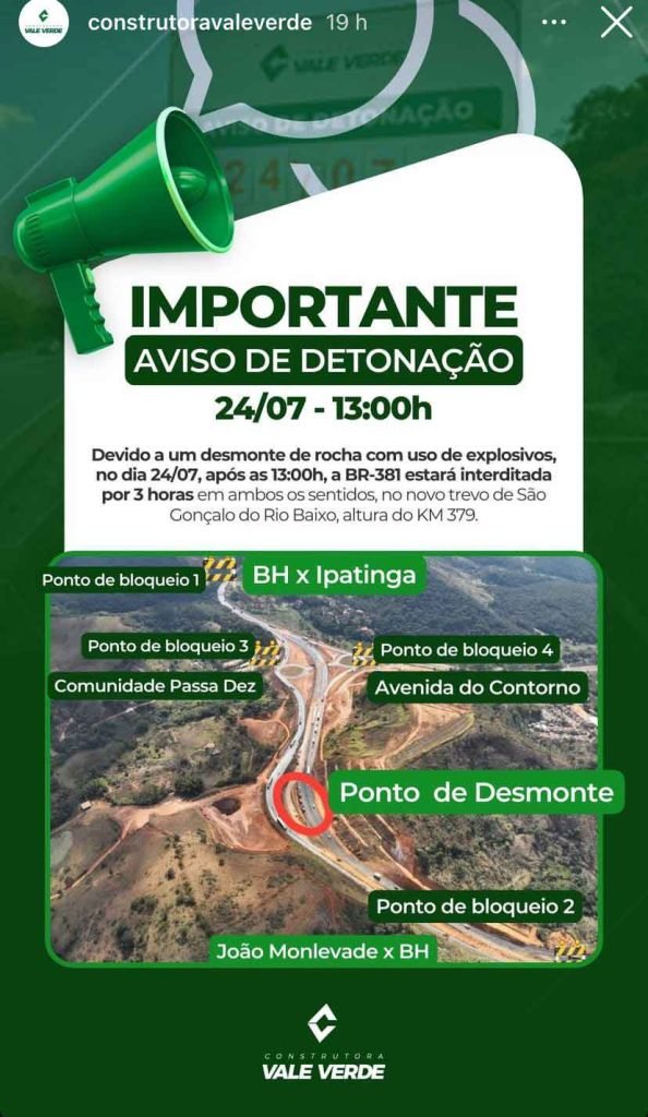 No próximo dia 24 de julho, a BR-381 será temporariamente interditada para a realização de um desmonte de rocha com uso de explosivos. A interrupção do tráfego acontecerá em ambos os sentidos da rodovia, no trecho do novo trevo de São Gonçalo do Rio Baixo, na altura do KM 379.