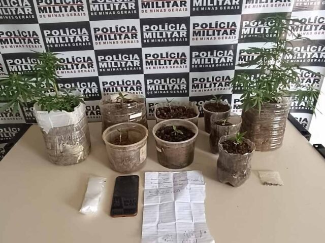 Ao chegarem ao local indicado, os policiais encontraram o suspeito e, durante a busca na residência, foram apreendidas 10 plantas de maconha, 27 sementes da mesma substância, material utilizado para embalar drogas (conhecido como “saquinhos de chup-chup”) e uma folha contendo anotações sobre a venda ilícita das drogas.