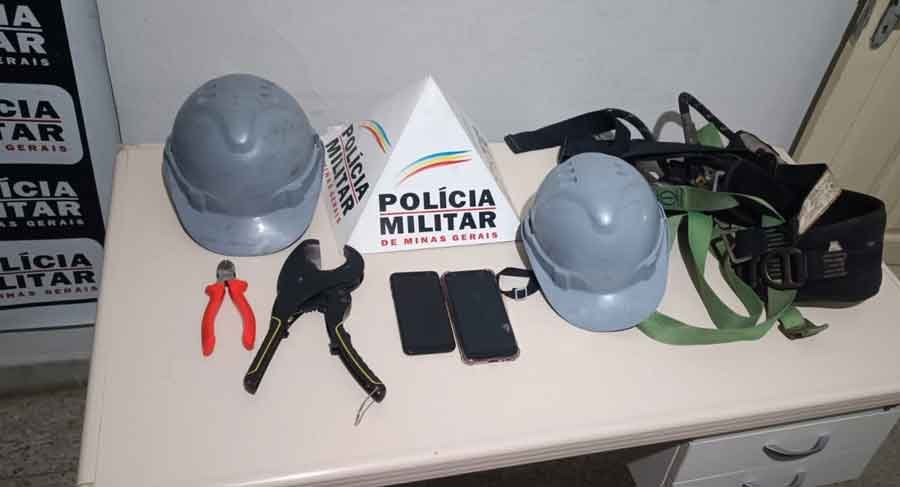Os dois homens foram presos e levados, junto com os materiais apreendidos, para a Delegacia de Polícia Civil de Nova Era. Entre os itens recuperados estão dois cones de sinalização, dois telefones celulares, R$ 300,00 em dinheiro, dois alicates, um cinto de segurança para trabalho em altura, um cabo de fios de cobre e dois capacetes de segurança.