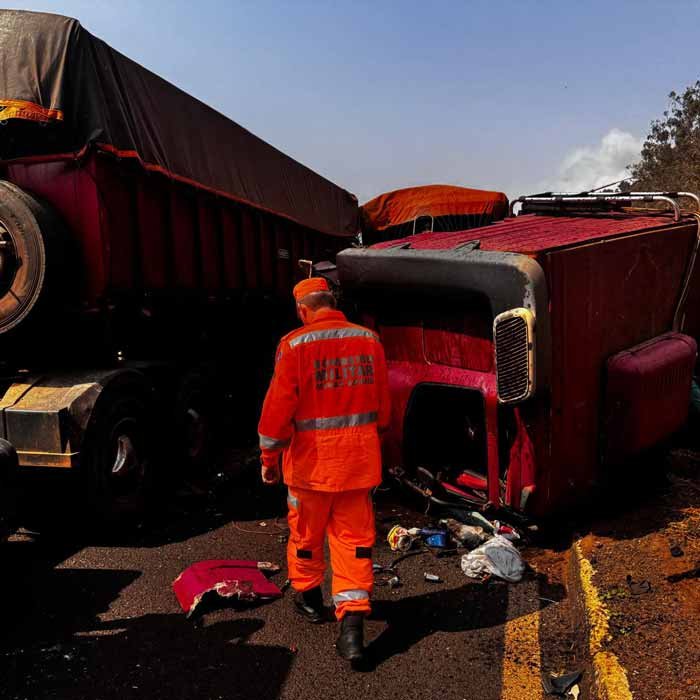 Na manhã desta quinta-feira (19/09), por volta das 9h20, o Corpo de Bombeiros Militar de Minas Gerais (CBMMG) foi acionado para atender um grave acidente envolvendo cinco caminhões na rodovia AMG-2595, próximo à avenida Filomena Cartafina, em Uberaba. O engavetamento teria sido causado por um incêndio em vegetação às margens da rodovia, que prejudicou a visibilidade dos motoristas e levou à colisão em cadeia.