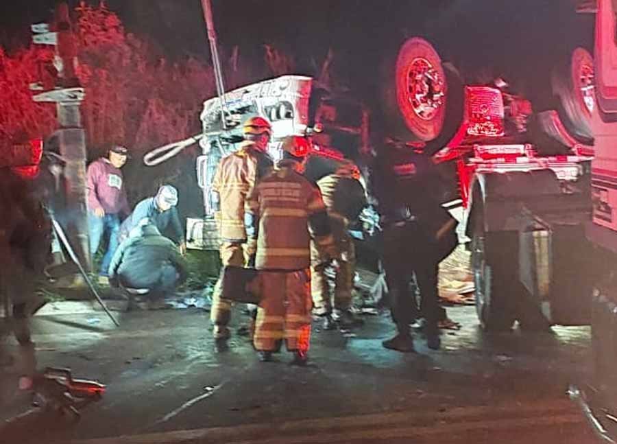 Na madrugada desta quarta-feira (16/10), por volta das 2h20, um caminhão carregado com batatas, vindo de Pará de Minas, perdeu o controle e capotou em uma curva nas proximidades do trevo de Rio Piracicaba, na BR-381. O veículo ficou completamente virado, com as rodas para cima e a cabine prensada ao solo, dificultando o resgate.