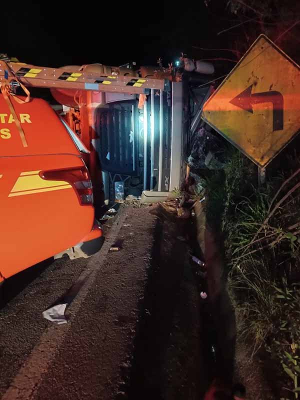Na madrugada deste sábado (16), o 6º Pelotão de Bombeiros foi acionado para atendimento a uma ocorrência de capotamento de caminhão/carreta na MGC 120, próximo a Garimpo de Capoeirana e o Rancho da Santinha. Ao chegar no local, os militares visualizaram uma carreta carregada com escora para cimento tombada em uma curva sinuosa.