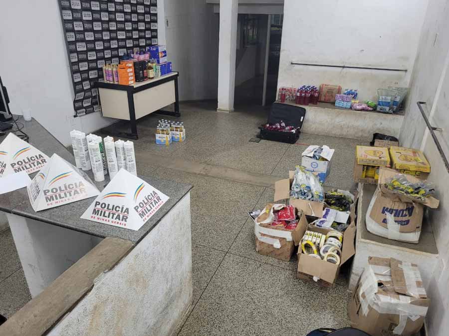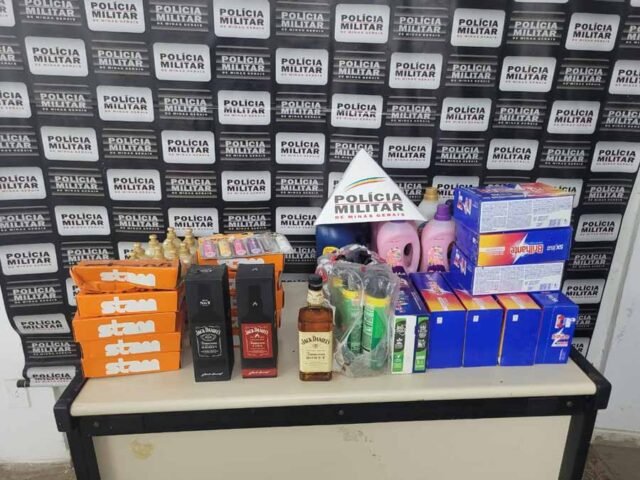 Após buscas no local, os policiais encontraram e apreenderam 10 caixas de fechadura, 12 unidades de creme para pentear, 11 unidades de amaciante de roupas, 8 caixas de sabão em pó, 1 cartela de isqueiro Bic, 5 sprays contra insetos, 18 sabonetes, 2 caixas de descarga, 3 fardos de cervejas, 1 fardo de refrigerante, 3 garrafas de whisky Jack Daniel’s, 1 garrafa de azeite, 12 caixas de leite, 18 molhos de pimenta, 8 esponjas de aço, 1 fardo de água de coco, 50 unidades de detergente, 4 pacotes de parafusos telheiro 5/16″ com 100 peças cada, 1 rolo de arame fino, 1 relé fotocélula modelo QR51 e 57 pacotes de pregos.