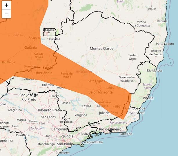 O Instituto Nacional de Meteorologia (INMET) publicou um aviso de perigo para chuvas intensas em 335 municípios de Minas Gerais. O alerta teve início às 9h30 deste sábado (30/11) e permanecerá válido até as 10h do domingo (01/12).