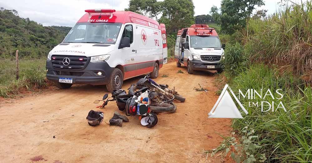 A Central de Regulação do Serviço de Atendimento Móvel de Urgência (SAMU) de Itabira recebeu o chamado para atendimento de três vítimas de colisão frontal entre duas motocicletas nesta quarta-feira (04/12) por volta das 14hrs, na Estada da Serra, próximo da Fazenda Boi Tempo no Distrito de Ipoema