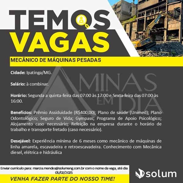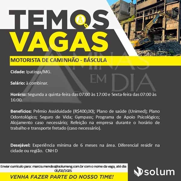 A Solum Demolidora está com vagas abertas para profissionais qualificados em Ipatinga e região. A empresa oferece oportunidades para as funções de Motorista de Caminhão Báscula e Mecânico de Máquinas Pesadas.