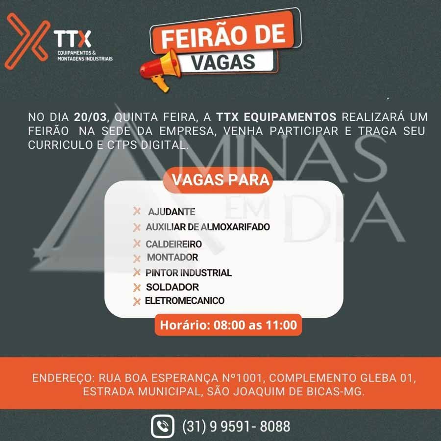 A TTX Equipamentos e Montagens Industriais, empresa referência no setor metalmecânico, realizará um Feirão de Vagas nesta quinta-feira, 20 de março, em sua sede, localizada em São Joaquim de Bicas (MG). A ação tem o objetivo de recrutar profissionais para diversas funções na indústria.