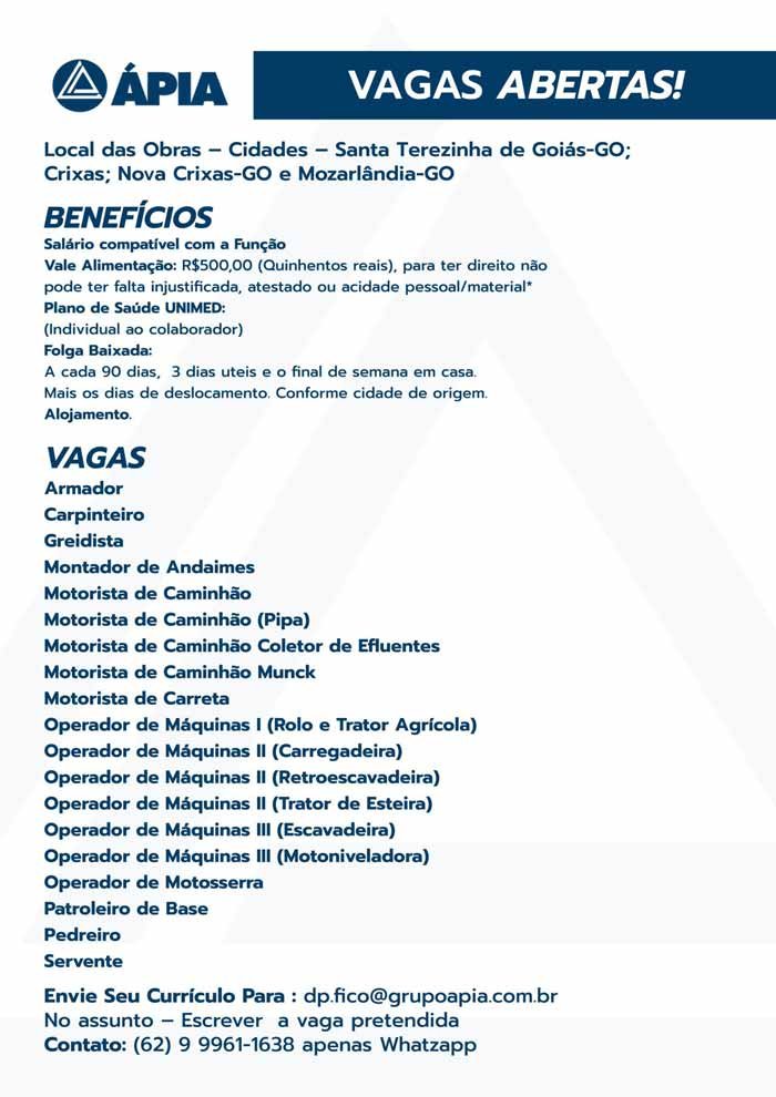 Se você está em busca de uma nova oportunidade no setor da construção civil, esta pode ser a sua chance! Construtora Ápia está com diversas vagas abertas para trabalhar em suas obras localizadas nas cidades de Santa Terezinha de Goiás (GO), Crixás (GO), Nova Crixás (GO) e Mozarlândia (GO).