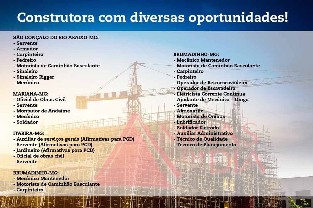 A Construtora Vale Verde, referência no setor da construção civil, está com diversas vagas de emprego abertas em Minas Gerais. As oportunidades são distribuídas entre as cidades de São Gonçalo do Rio Abaixo, Mariana, Itabira e Brumadinho, com destaque para vagas extensivas a Pessoas com Deficiência (PCDs).
