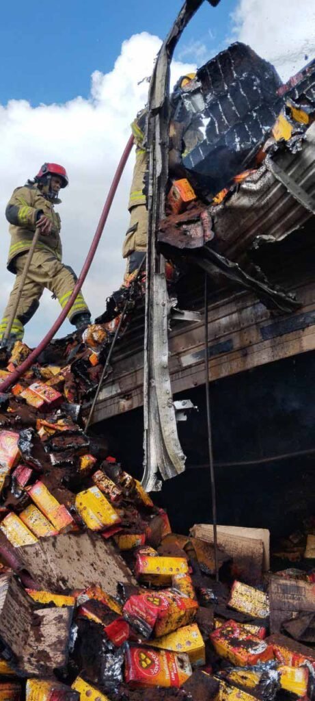 De acordo com os bombeiros, o fogo atingiu exclusivamente o semirreboque do veículo. O cavalo mecânico foi desacoplado a tempo e não chegou a ser atingido pelas chamas. A carga transportada era composta por café embalado, mas ainda não há informações oficiais sobre a quantidade total do produto nem quanto foi consumido pelas chamas.