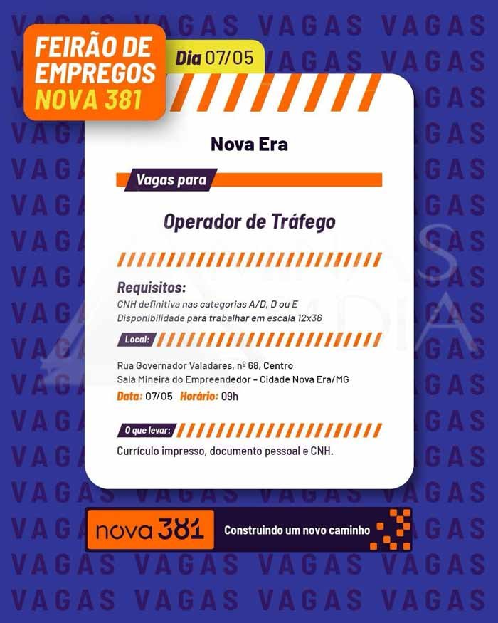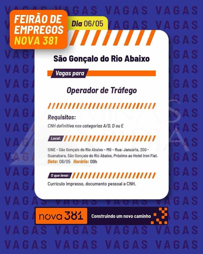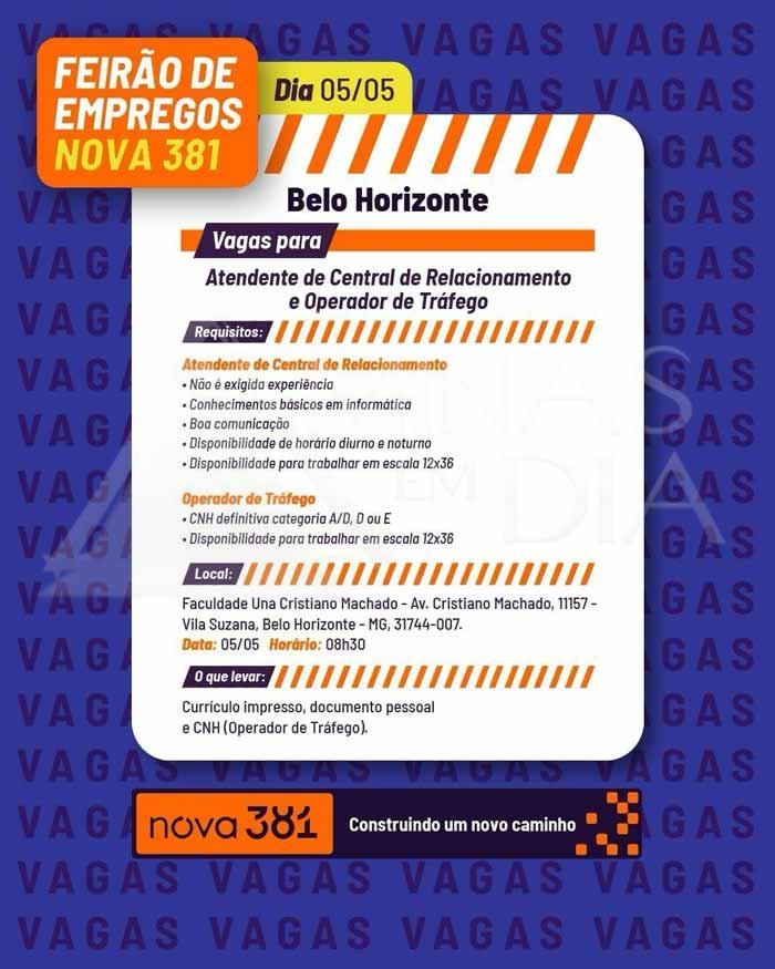 A Concessionária Nova 381, responsável pela administração de trechos da BR-381 em Minas Gerais, vai realizar feirões de emprego com vagas abertas para os cargos de Atendente de Central de Relacionamento e Operador de Tráfego. As ações acontecerão em Belo Horizonte, São Gonçalo do Rio Abaixo e Nova Era, entre os dias 5 e 7 de maio.